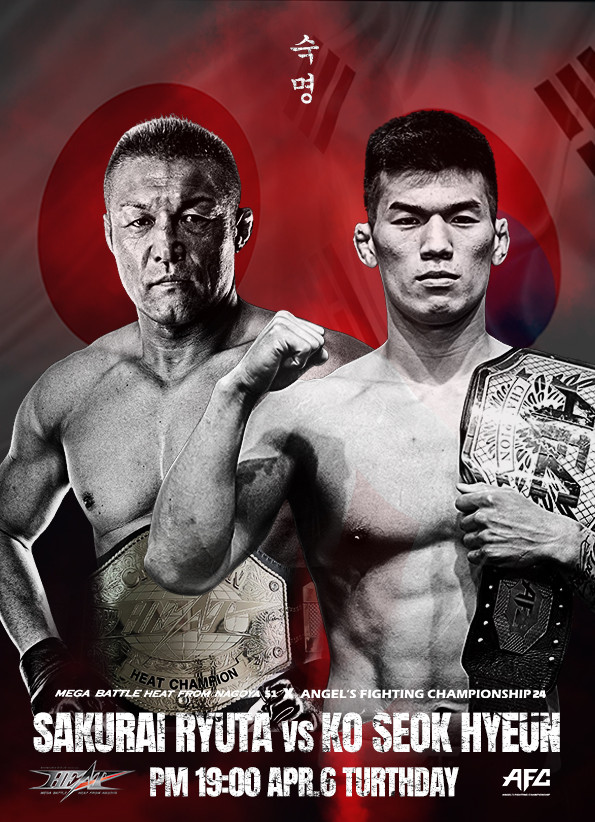 고석현과 사쿠라이 류타가 4월6일 경기도 광명AK몰 아이벡스튜디오에서 열리는 AFC 24(히트 51)에서 AFC X HEAT 미들급통합 타이틀전 대결을 펼친다.