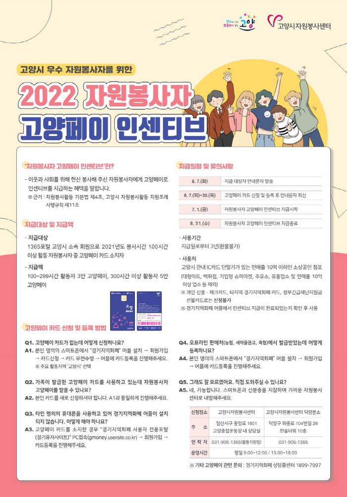 2022년 고양페이를 지급받게 되는 자원봉사자는 1,370여 명이다. 1365자원봉사포털 고양시 소속 회원으로 2021년도 1년 간 100시간~299시간 활동 자원봉사자에게는 3만 고양페이, 300시간 이상 활동 자원봉사자에는 5만 고양페이가 지급된다. 센터는 6월 초 자원봉사자 고양페이 인센티브 대상자들에게 별도로 안내하고, 7월부터 8월까지 인센티브를 지급할 예정이다. 자세한 신청방법은 센터 홈페이지 공지사항 및 포스터 참고.