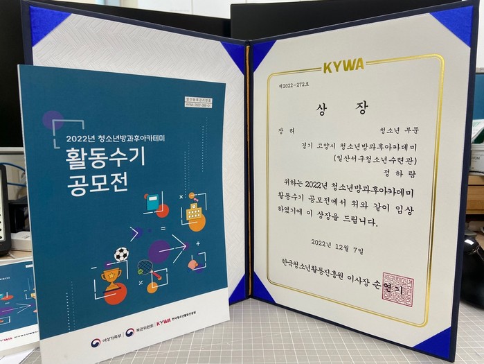 [부자동네타임즈 김인수기자] 고양시청소년재단(이사장 이동환) 일산서구청소년수련관 방과후아카데미 ‘라온꿈터’에서는 한국청소년활동진흥원에서 주최한 ‘2022년 청소년방과후아카데미 공모전(우수사례, 활동수기)에 참여하여 활동수기 부분에서 진흥원 이사장상을 수상하였다.
