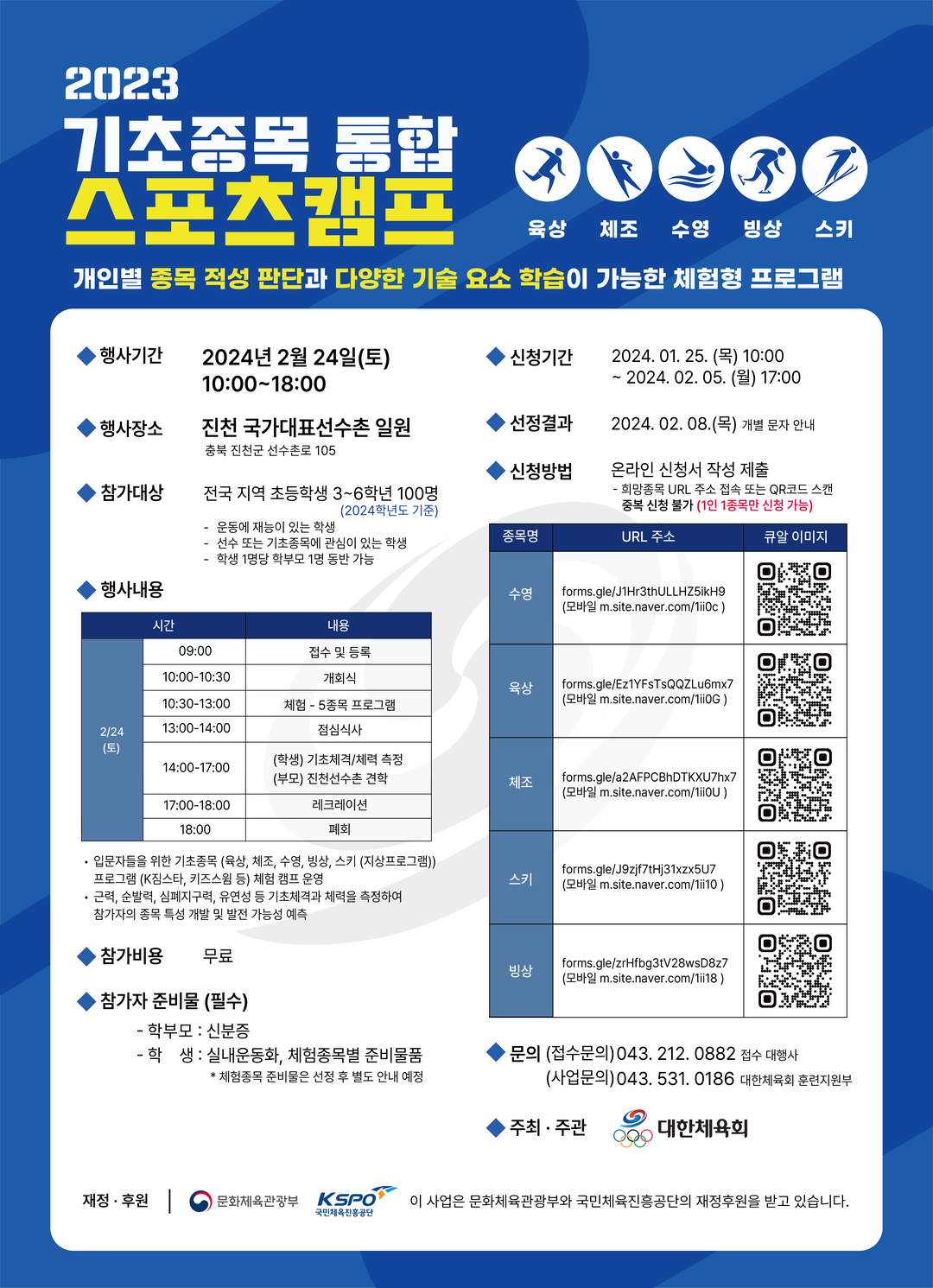 이번 캠프는 2월 24일(토) 오전 10시부터 오후 6시까지 진천 국가대표선수촌에서 진행하며, 기초종목 입문자를 위한 수영·체조·육상·빙상·스키 체험 프로그램과 참가자의 근력, 순발력, 심폐지구력 등 기초체력 측정 프로그램을 운영한다. 참가자의 종목 특성 개발 및 발전 가능성 예측에 도움이 되기 위한 측정 결과 자료를 제공할 예정이며 참가자의 학부모들을 위한 진천 국가대표선수촌 견학 프로그램도 함께 진행한다.