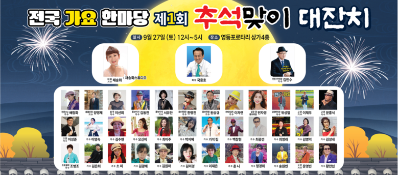 오는 27일(토) 12시부터 17까지 영등포구 영등포로 219번지 영등포시장로타리 로타리상가 4층 전국가요한마당 대강당에서 전국가요한마당이 주최하는 제1회 추석맞이 대잔치가 고향의 정과 흥겨운 가락 속에 성대하게 펼쳐진다. 이번 행사는 민족 최대 명절인 추석을 맞아 가족과 이웃이 함께 어울리며 전통의 의미를 되새기고, 음악을 통해 하나 되는 장을 마련하기 위해 기획됐다.
