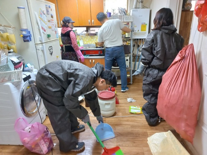 이날은 지역에서 활동하는 말씀세움교회의 봉사자 6명을 주축으로 행주동 행정복지센터와 함께 관내 저장 강박 의심 가구 1곳의 집 청소와 방역, 폐기물 처리를 진행했다.