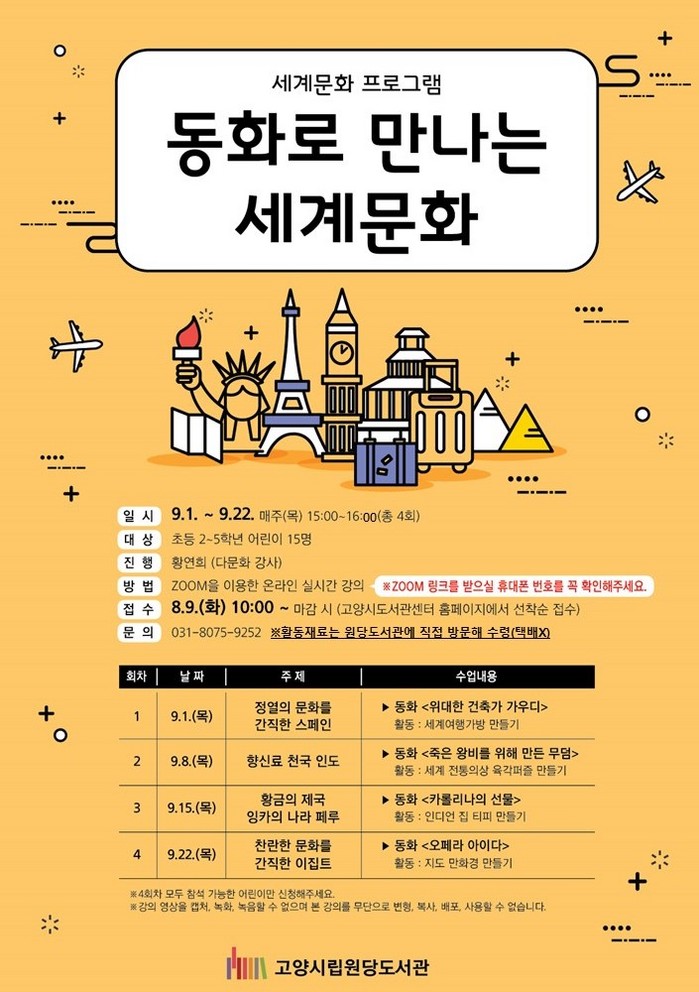참여 신청은 8월 9일(화)부터 고양시도서관센터 홈페이지 독서문화→프로그램 신청에서 선착순으로 할 수 있다. 기타 자세한 사항은 원당도서관으로 문의하면 된다.
