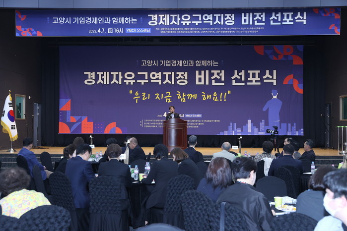 7일 고양시 기업경제인들은 일산동구 Y컨벤션에서 ‘2024년 고양특례시 경제자유구역 지정을 염원하는 비전선포식’을 개최했다. 이날 이동환 고양특례시장을 비롯해 국회의원, 도의원, 시의회, 기업·경제인, 대학, 창업센터, 고양시민 등 200여 명이 참석하였다.