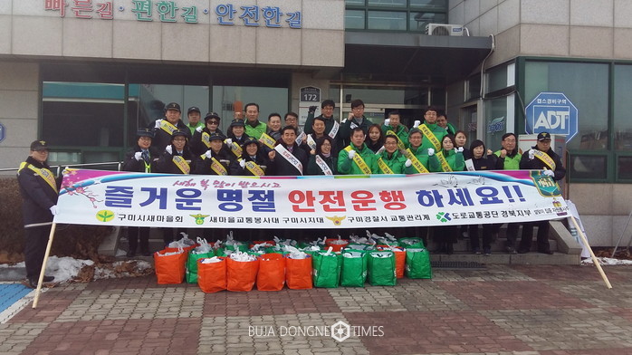 [부자동네타임즈 서소민 기자]구미시새마을회(회장 김봉재)에서는 1월 26일(금) 오후2시부터 구미의 관문인 구미IC와 구미역 및 선산IC에서 새마을교통봉사대와 새마을남.여지도자 등 60여명이 설날을 맞이하여 고향을 방문하는 귀성객들을 맞이하여 안전운전캠페인을 실시했다.