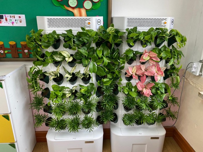 센터는 실내 수직정원을 통해 1개 교실 당 60본의 공기정화식물(스칸답서스, 테이블야자, 스노우사파이어 등)을 비치했다. 온도, 습도, 미세먼지 정보를 실시간으로 측정하는 공기질 측정기도 함께 공급하여 공기정화식물의 도입효과도 눈으로 확인할 수 있게 했다.