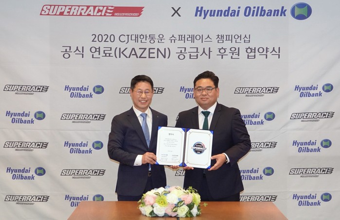 [부자동네타임즈 김인수기자] 국내 최고의 모터스포츠 대회인 2020 CJ대한통운 슈퍼레이스 챔피언십이 현대오일뱅크의 최고 품질 고급휘발유를 만났다. 지난해에 이어 현대오일뱅크가 대회 공식 연료 공급사로 참여하면서 안정적이고 수준 높은 레이스가 펼쳐질 것으로 기대된다. 최기화 현대오일뱅크 마케팅지원부문장과 김동빈 ㈜슈퍼레이스 대표는 상호 간의 발전을 위해 노력할 것을 약속하며 협약서에 서명했다.