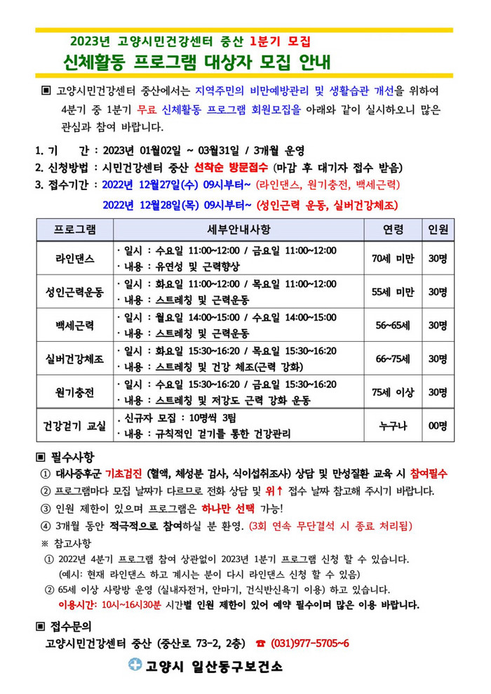 참여를 원하는 주민은 12월 27일부터 시작되는 신청기간 내 직접 센터에 방문하여 신청.접수 하면 된다. 자세한 문의는 고양시민건강센터로 문의하면 된다.