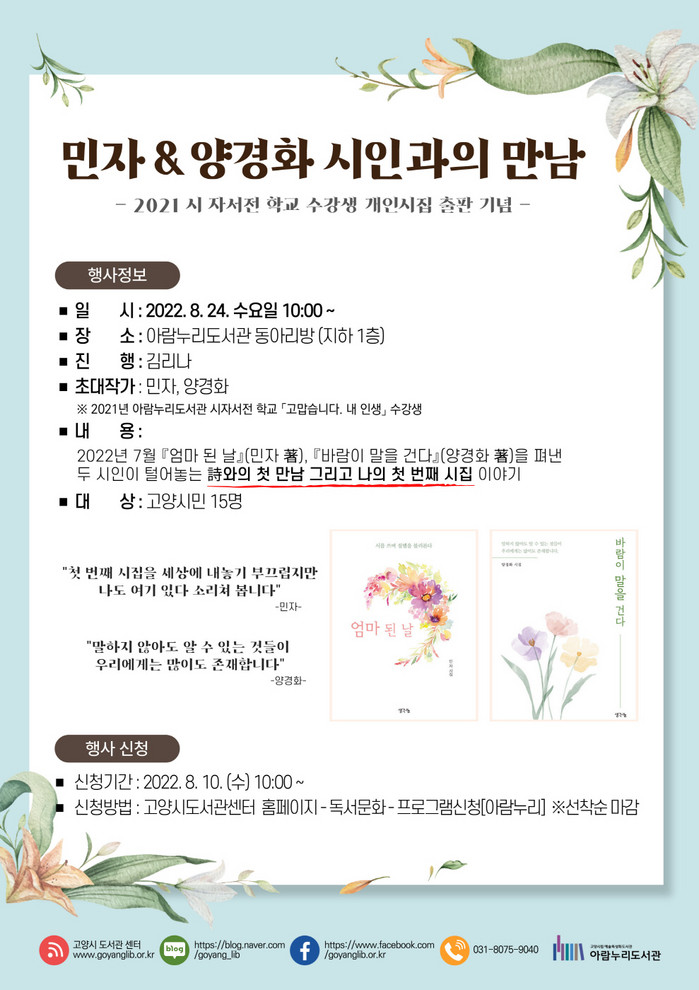 [부자동네타임즈 김인수기자] 고양특례시(시장 이동환) 아람누리도서관이 오는 8월 24일(수) 올해 7월 첫 번째 시집을 발표한 민자, 양경화 두 시인과의 만남을 개최한다.