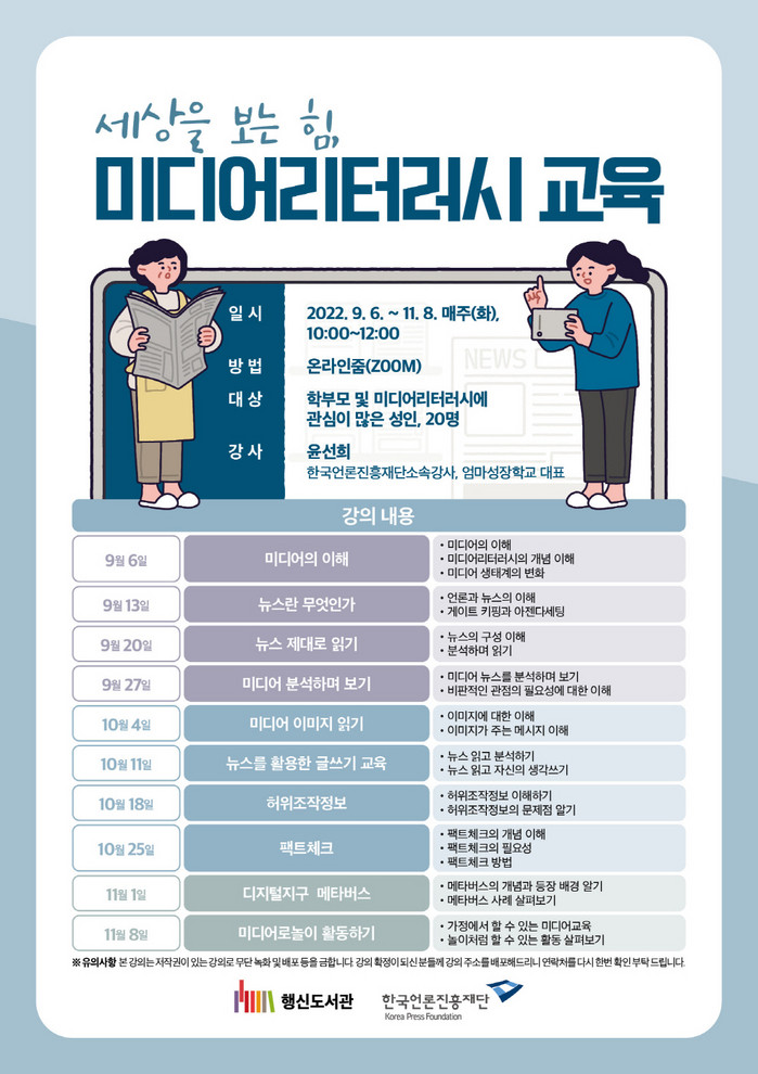 [부자동네타임즈 김인수기자] 고양특례시(시장 이동환) 행신도서관이 고양시민을 대상으로 9월 6일(화)부터 11월 8일(화)까지 한국언론진흥재단과 함께하는 세상을 보는 힘, 미디어리터러시 교육을 운영한다.