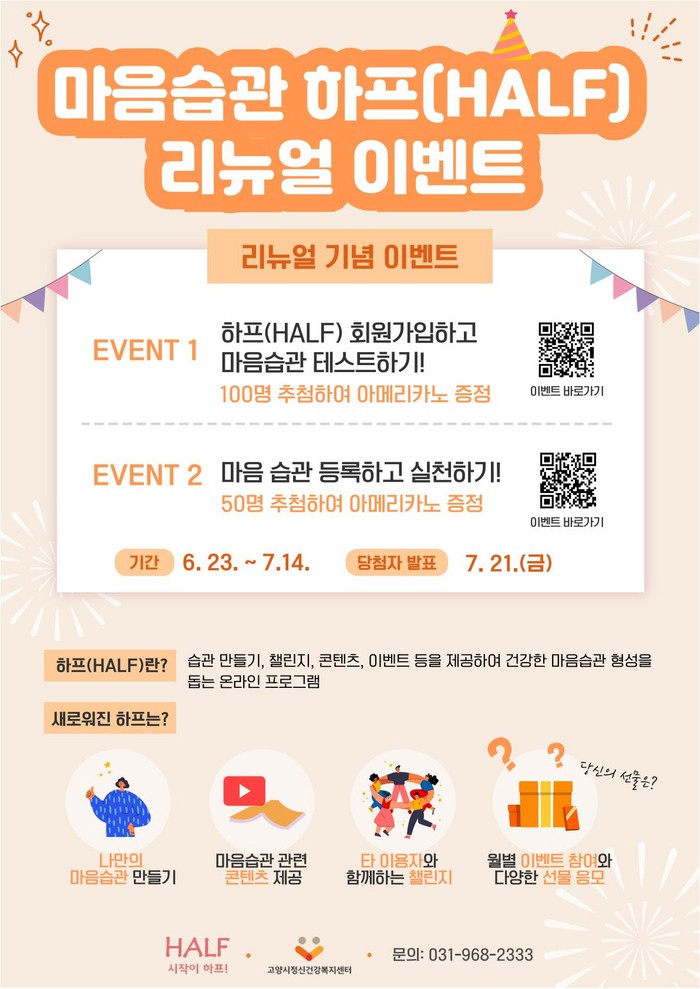 센터는 마음습관 하프 새단장을 기념해 6월 23일부터 7월 14일까지 이벤트 ▲마음습관 테스트 참여하기 ▲마음 습관 등록하고 실천하기 2종을 운영한다. 센터는 총 150명을 추첨하여 커피 쿠폰을 증정할 예정이다.