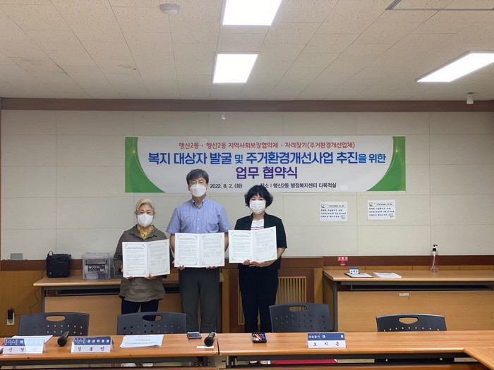 [부자동네타임즈 김인수기자] 고양특례시 덕양구 행신2동행정복지센터(동장 김봉민)는 동 지역사회보장협의체(위원장 신경자) 및 정리 수납 전문 단체 ‘자리찾기’(대표 오지은)와 지난 2일, 복지 대상자 발굴 및 주거환경 개선사업 추진에 관한 업무협약을 체결했다.