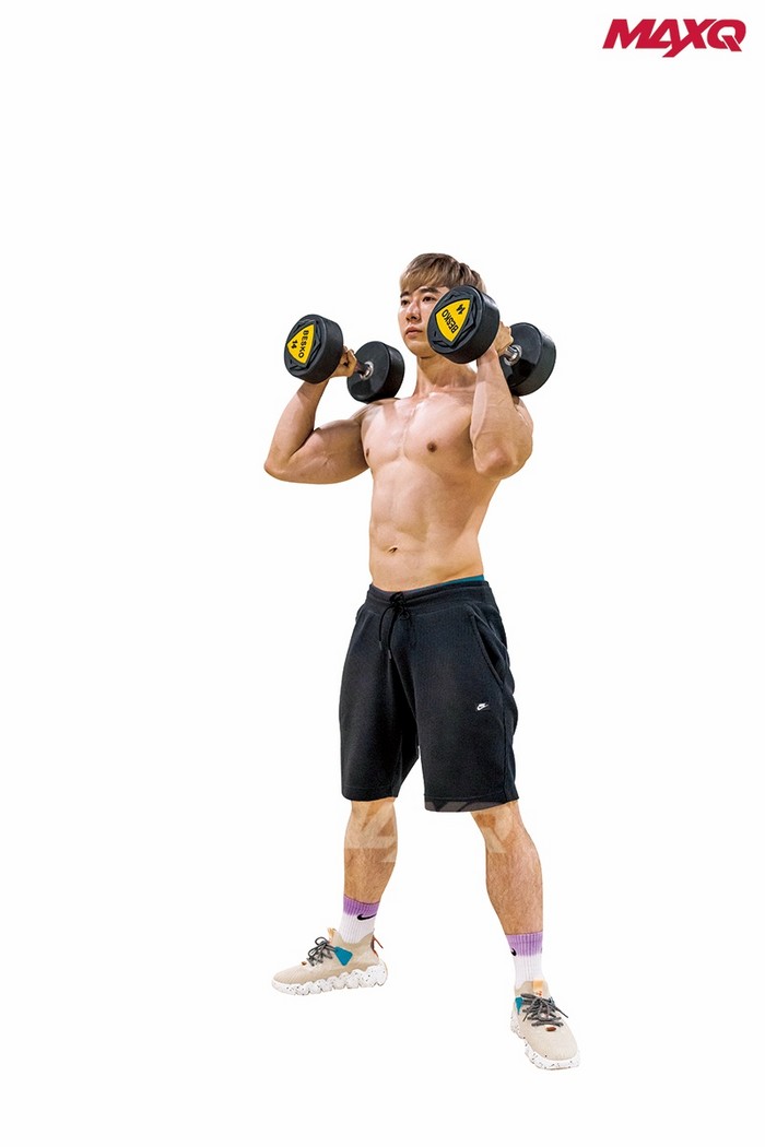발바닥은 지면에 닿아 덤벨을 하늘을 향해 밀어준다. 천천히 원위치 시킨다.