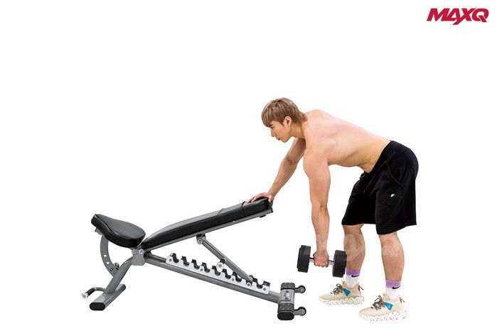 덤벨을 몸통 가깝게 가져오고 앞으로 기울여준다. 이때 허리는 아치형을 만들어주되 과도한 아치는 부담을 줄 수 있으므로 주의한다. 무릎까지 덤벨이 내려왔으면 원위치.