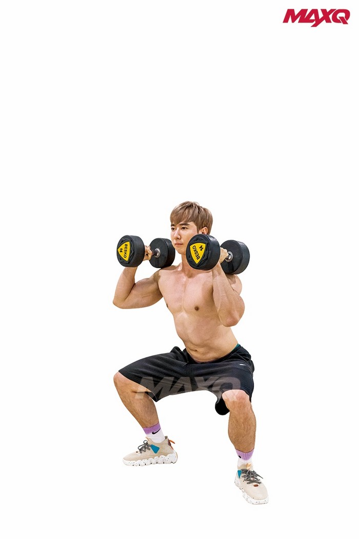 어깨에 덤벨을 올려놓고 정면을 응시한다. 허리를 펴준다. 발바닥을 지면에 밀어준다는 느낌으로 천천히 무릎까지 앉아준다 이때 무릎은 발끝과 같은 방향을 바라본다 원위치.