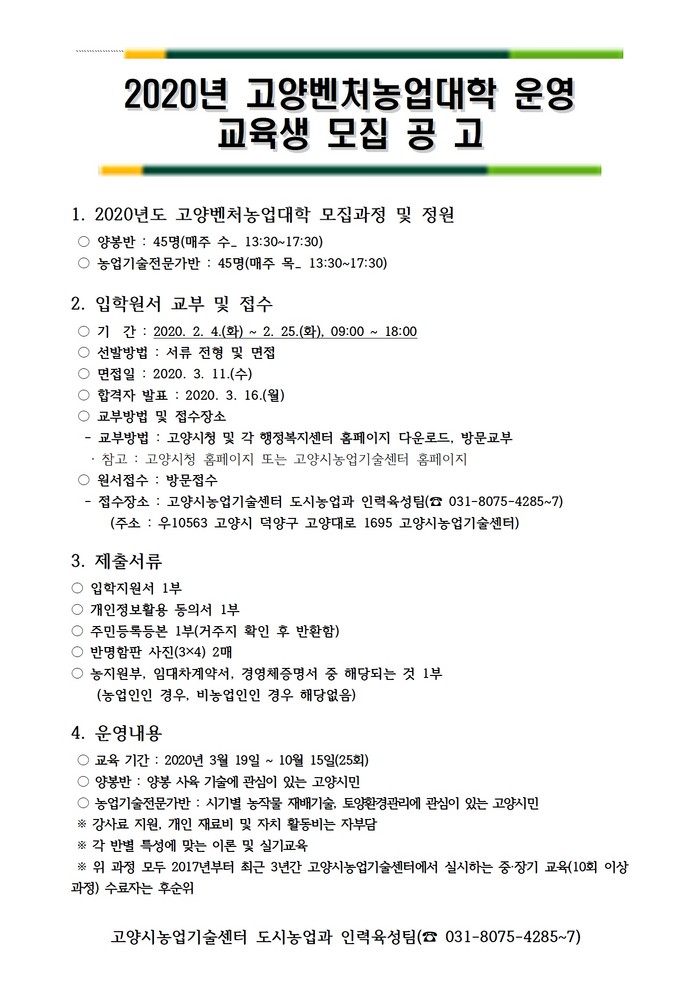 [부자동네타임즈 김인수기자] 고양시 (시장 이재준)는 오는 25일까지 미래 농업을 이끌어갈 2020년도 고양벤처농업대학 교육생을 모집한다고 밝혔다.