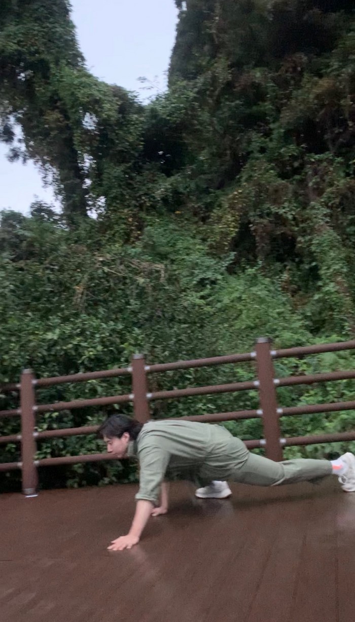 팔굽혀펴기 동작을 실시 후 왼손이 나가면 오른쪽 다리를 몸통과 가깝게 이동시켜준다.