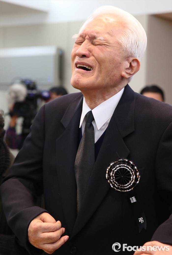 (서울=포커스뉴스) 25일 오후 서울 종로구 서울대병원 장례식장에 마련된 고 김영삼 전 대통령의 빈소에서 최형우 전 내무부 장관이 조문을 하며 오열하고 있다.