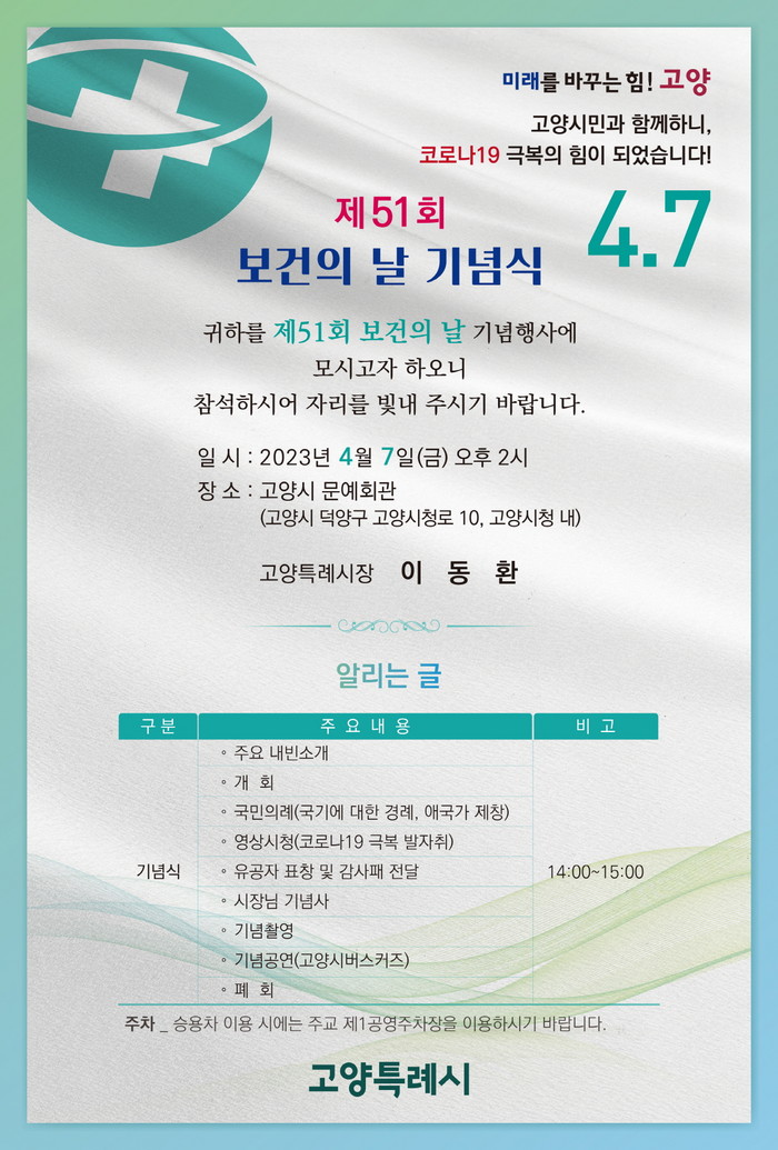 [부자동네타임즈 김인수기자] 일산동구보건소는 제51회 보건의 날을 기념하여 4월 7일 고양시 문예회관에서 기념행사를 열고 코로나 유공자에게 표창할 계획이다.