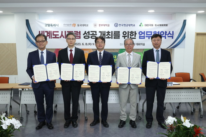 [부자동네타임즈 김인수기자] 고양특례시(시장 이동환)는 6월 8일(목) 고양시청에서 동국대(총장 윤재웅), 중부대(총장 이정열), 한국항공대(총장 허희영), 대한국토·도시계획학회(회장 김찬호)와 「2023 세계도시포럼의 성공적 개최를 위한 업무협약(MOU)」을 체결하였다.