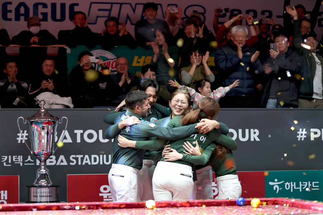 [부자동네타임즈 = 김인수 기자] 지난 27일 경기도 고양시 ‘고양 킨텍스 PBA 스타디움’에서 열린 ‘웰컴저축은행 PBA 팀리그 2023-2024 포스트시즌’ 파이널 7차전서 SK렌터카를 세트스코어 4:1로 꺾고 파이널 합산 전적 4승3패로 시즌 우승을 차지했다.