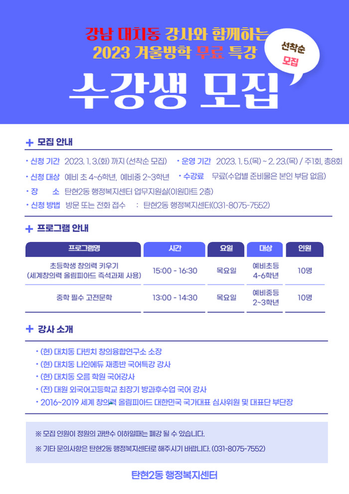 겨울방학 무료특강과 관련한 문의사항은 탄현2동 행정복지센터 맞춤형 복지팀(☎031-8075-7552)으로 문의하면 된다.