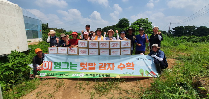 이번 활동에는 백석1동 주민자치회 위원들과 통장협의회 회원 등 20여 명이 참석하여 지난 3월 심은 씨감자를 수확했다. 이날 수확한 햇감자 420㎏의 판매 수익금 전액은 여름철 어려움을 겪는 이웃을 돕는데 사용될 예정이다.