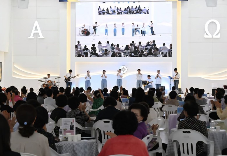 12일 신천지 군산교회 1층에 설치된 포토존에서 참석자들이 사진을 찍으며 즐거운 시간 을 보내고 있다.