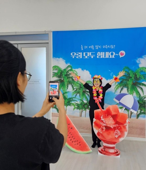 포토존에는 대형 수박과 음료을 먹는 모습을 유쾌하게 연출하며 사진을 찍는 시민들로 줄이 이어졌다.