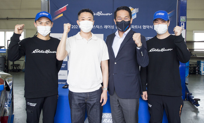 [CJ로지스틱스 공식 의류 협약 체결. (왼쪽부터 순서대로)CJ로지스틱스 최광빈 드라이버, CJ ENM 스포츠팀 김진웅 대리, CJ로지스틱스레이싱 이정웅 감독, 문성학 드라이버]