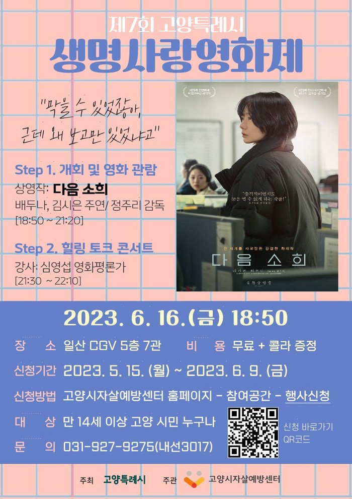 영화제 신청은 5월 15일(월)부터 6월 9일(금)까지 ▲고양시자살예방센터 홈페이지의 행사신청 메뉴 ▲홍보 포스터 속 QR코드 접속를 통해 가능하다.