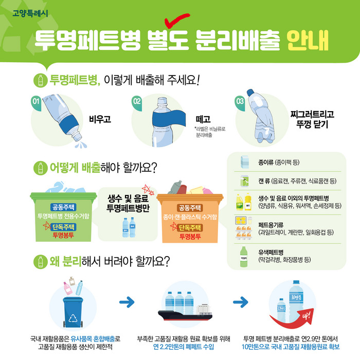 고부가가치 재활용가능자원인 투명페트병이 고품질 원료로 재활용되는 건 약 10%에 불과한 현실을 반영하여, 투명페트병을 별도로 수거하기 위해「재활용가능자원의 분리수거 등에 관한 지침」이 개정·시행되어 ‘투명페트병 별도 분리배출제’가 의무화되었다.