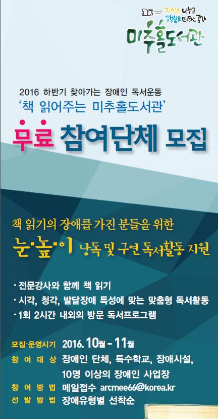참여대상은 장애인 단체, 특수학교, 장애시설, 10명 이상의 장애인 사업장이며, 참여를 희망하는 장애인 단체는 이메일(arcmee66@korea.kr)로 신청하면 된다. 기타 자세한 사항은 도서관 홈페이지(http://www.michuhollib.go.kr)를 참고하거나 전화(☎032-440-6646)로 문의하면 된다.