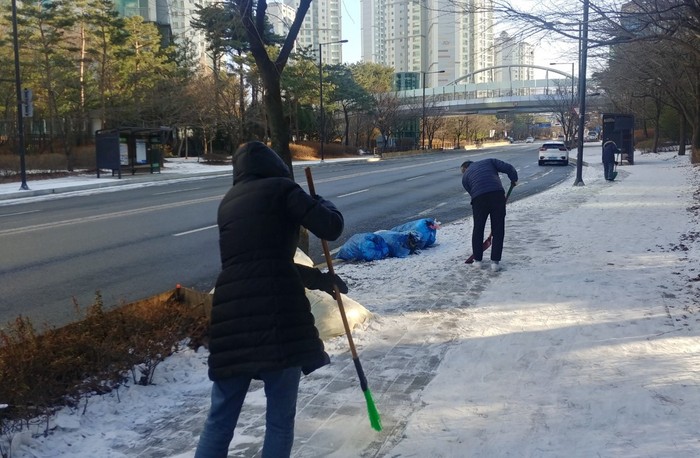 빙판길로 인해 보행자가 넘어지는 사고를 최대한 예방하고자, 제설 사각지대가 발견되는 즉시 현장 출장을 나가 빙판길 보행길 내기와 염화칼슘 작업을 완료하였으며, 아울러 버스승강장, 가로등, 인도 등의 지역 내 시설물 점검도 병행 실시하였다.