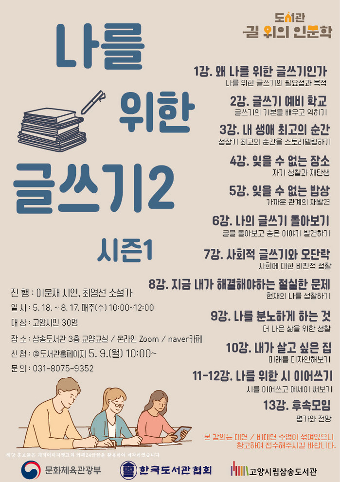 [부자동네타임즈 김인수기자] 고양시 삼송도서관에서 오는 5월 18일부터 8월 17일까지 이문재 시인, 최영선 소설가와 함께 삶의 기억을 글쓰기로 돌아보는 2022 도서관 길 위의 인문학 프로그램 ‘나를 위한 글쓰기2 시즌1’을 진행한다.