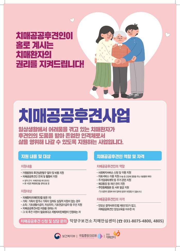 치매공공후견사업에 관한 자세한 내용은 덕양구보건소 치매안심센터로 문의하면 된다.