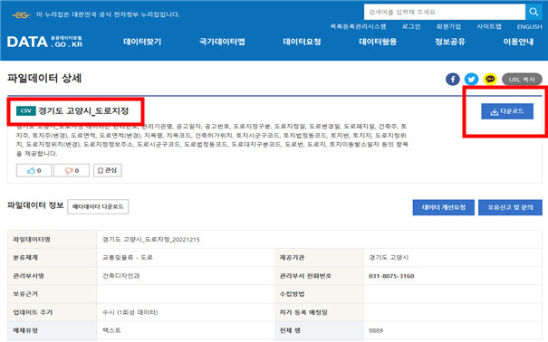 그 결과 누구나 쉽게 행정안전부에서 운영하는 공공데이터포털을 통해 고양시의 도로지정 내역을 쉽게 확인할 수 있다.