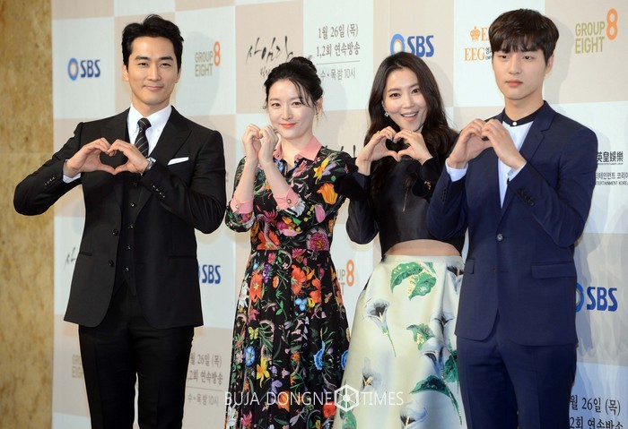 배우 송승헌, 이영애, 오윤아, 양세종이 24일 오후 서울 중구 롯데호텔에서 열린 SBS 드라마 ‘사임당, 빛의 일기’ 제작발표회에서 포토타임을 갖고 있다. ‘사임당, 빛의 일기’는 한국미술사를 전공한 시간강사 서지윤(이영애)이 이탈리아에서 우연히 발견한 사임당(이영애) 일기에 얽힌 비밀을 과거와 현재를 넘나들며 풀어내는 퓨전사극으로 일기 속에 숨겨진 천재화가 사임당의 삶과 ‘조선판 개츠비’ 이겸(송승헌)과의 인연을 작가의 상상력으로 아름답게 그려낸다. 2017.01.24.
