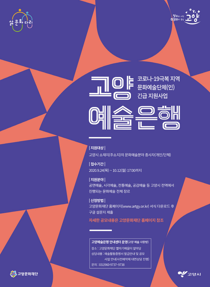 고양예술은행은 마치 ‘예술가를 위한 은행’과 같은 뜻이며, 향후 108만 고양시민을 위해 실행가능한 문화예술사업의 기획을 엄선해 지원한다. 코로나-19로 직접적인 활동이 어려운 현실을 감안해 지역 예술인들의 예술기획 아이디어를 지원하는 개념이다. 공모과정을 거쳐 총 200개의 사업을 선정해 사업당 동일하게 100만원을 상금으로 지원할 계획으로 별도의 정산과정은 생략된다. 고양시에 주소지를 두고 최근 3년간 1건 이상의 활동실적이 있는 예술단체와 개인 모두 신청가능하다. 단, 개인의 경우는 문화체육관광부 산하 한국예술인복지재단에서 발급한 ‘예술활동증명서’를 소지해야 한다. 공모 분야는 공연예술, 시각예술, 전통예술, 공감예술 총 4개 분야로 각 분야의 장르별 선정비율을 안배할 방침이다. 공모신청 접수기간은 9월 24일(목)부터 10월 12일(월)까지 약 20일간이고 서류서식 다운로드와 신청 접수방법은 고양문화재단 홈페이지를 참고하면 된다.