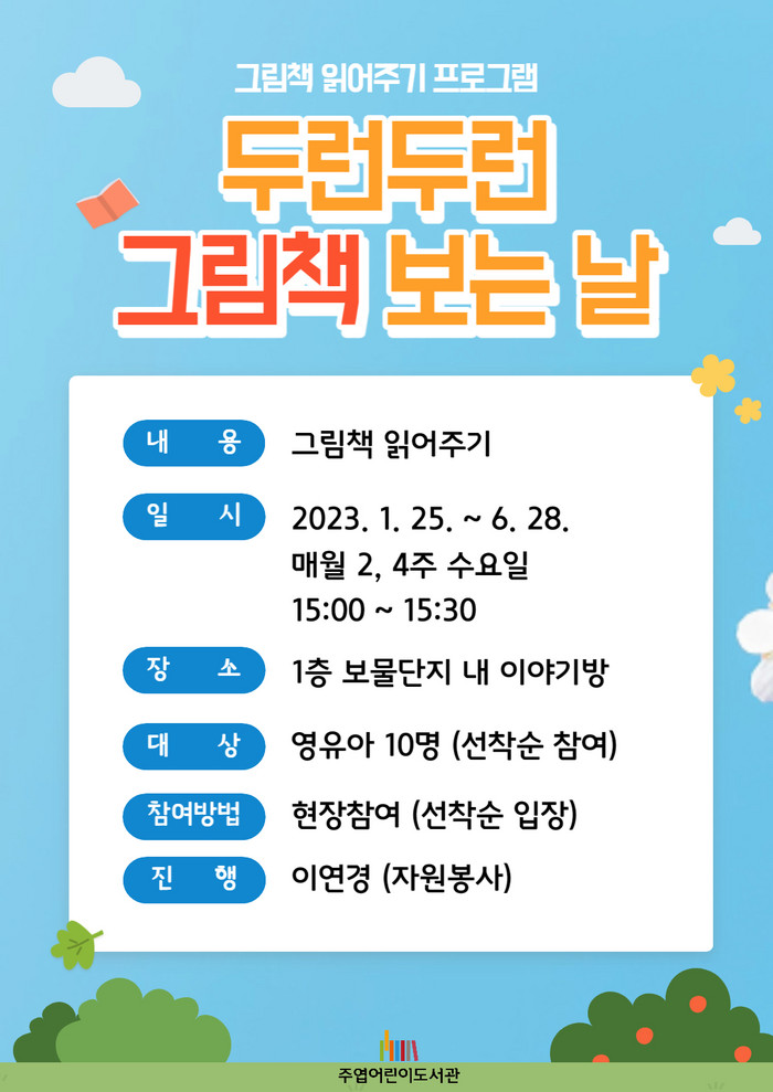 프로그램은 이연경 자원봉사자가 진행하며 1월 25일부터 6월 28일까지 매월 2, 4주 수요일 오후 3시부터 30분간 운영된다. 영유아 10명을 대상으로 도서관 1층 보물단지 자료실 내 이야기방에서 진행할 예정이다.