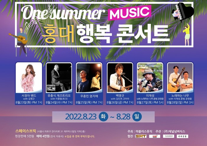8월 23일부터 28일까지 펼치는 이번 무대는 포크를 기반으로 락, 재즈, 트로트까지 다양한 음악을 함께하는 콘서트로 요일별 각각의 색깔로 2시간씩 공연을 채워간다.