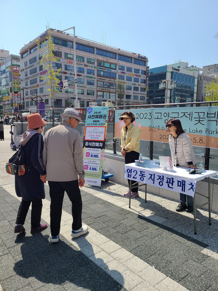 코로나19 이후 4년 만에 개최되는 꽃박람회의 개최일이 20여 일 앞으로 다가왔다. 주엽2동에서는 ‘2023고양국제꽃박람회’의 성공적인 개최를 위해 기존에 동 행정복지센터 민원실에서 판매 중인 꽃박람회 사전예매권을 유동인구가 많은 주엽역에서 이동판매대를 운영하여 꽃박람회 홍보 및 사전예매권을 판매했다.