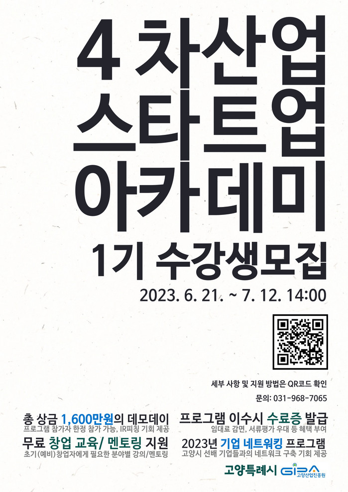 [부자동네타임즈 김인수기자] 고양산업진흥원은 고양시 내 기술창업 확산을 위해 창업 아이디어를 보유한 예비, 초기 창업자 등을 대상으로 ‘4차 산업 스타트업 아카데미’ 1기 참가자를 모집한다.