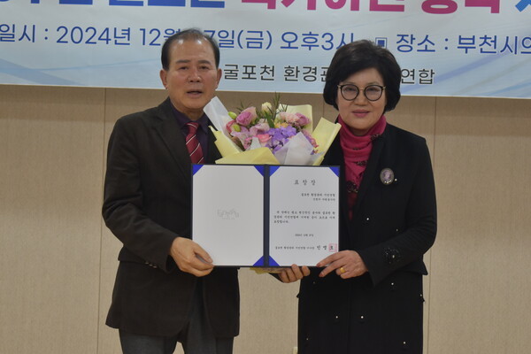 | ▲지난 27일 열린 ‘제8주년 굴포천 국가하천 승격 지정 기념식’에서 굴포천 환경관리 시민연합 민맹호 이사장(사진 왼쪽)과 신천지자원봉사단 부천지부 송연진 부지부장이 기념사진을 촬영하고 있다. [사진 제공 = 신천지자원봉사단 부천지부] |