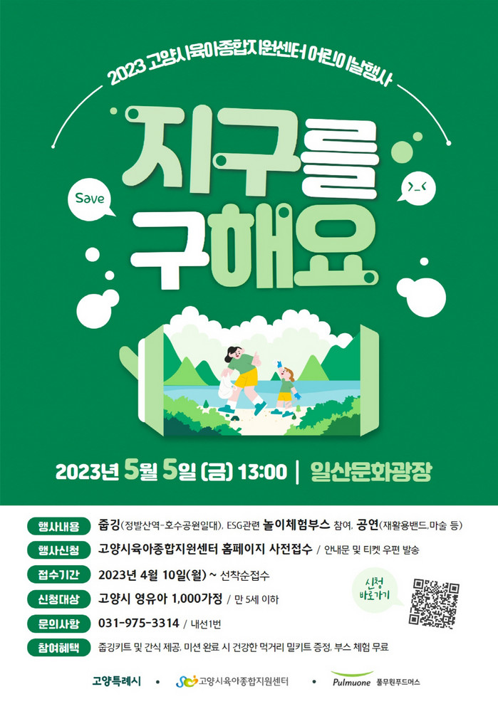 [부자동네타임즈 김인수기자] 고양시육아종합지원센터가 어린이날을 맞이하여 어린이날행사 ‘지구해요(지구를 구해요)’를 개최한다. 고양시 및 풀무원의 후원으로 진행되는 본 행사는 5월 5일(금) 오후 1시 일산문화광장(경기도 고양시 일산동구 중앙로 1271-4)에서 진행된다.