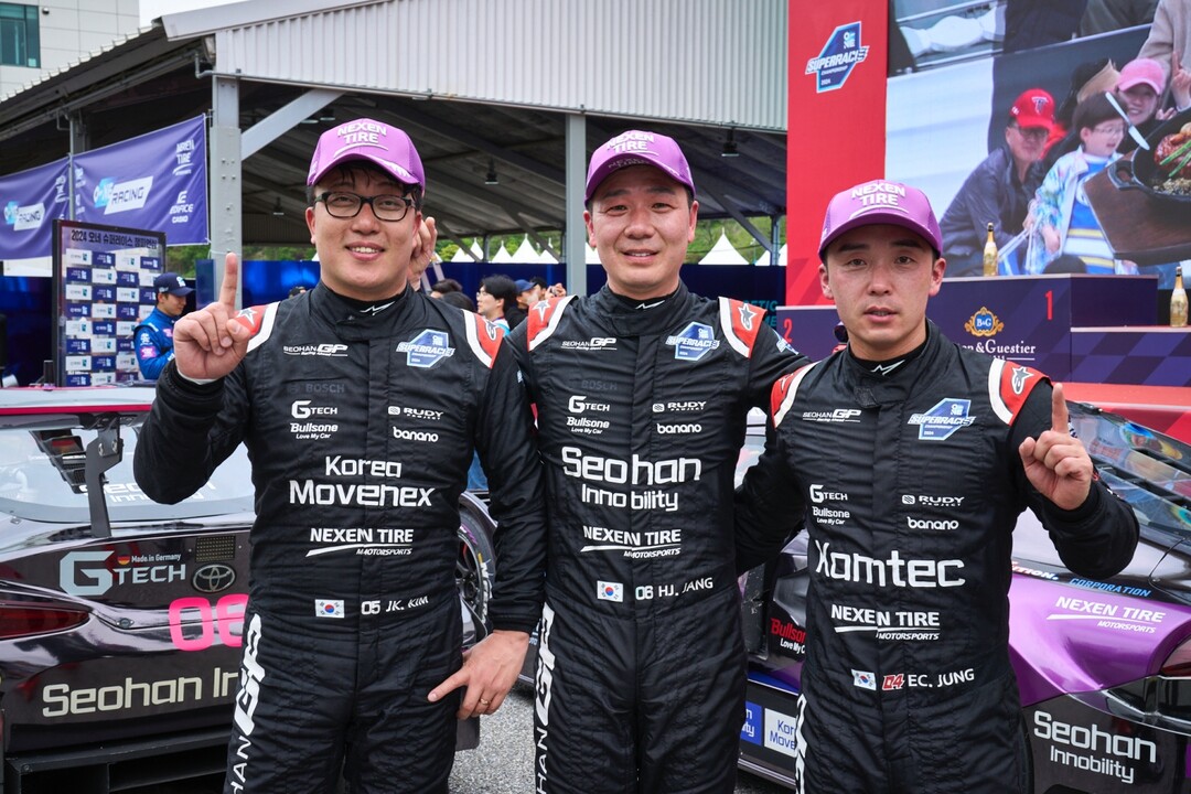 [사진 설명] 2라운드 포디엄에 오른 서한GP 김중군(왼쪽부터), 장현진, 정의철이 경기 후 포즈를 취하고 있다.