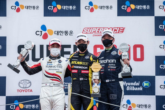 [사진설명] 엑스타 레이싱 정의철, 아트라스BX 모터스포츠 김종겸, 서한 GP 장현진(왼쪽부터)이 2020 CJ대한통운 슈퍼레이스 챔피언십 슈퍼 6000 클래스 1라운드에서 나란히 포디움에 올랐다.