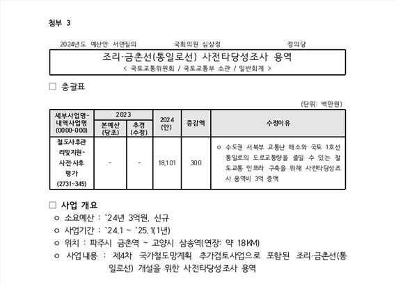[부자동네타임즈 = 김인수 기자] 심상정 의원실은 "12월 23일 국회 본회의에서 의결된 24년도 예산안에 통일로선(삼송~관산~내유~금촌) 사업추진방안 연구용역비 3억 원이 반영되었다"라고 밝혔다.