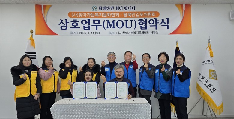 사단법인 찾아가는복지문화협회와 탈북민김포위원회가 지난 11일 김포시 풍무동 사무실에서 상호협력 업무협약(MOU)을 체결했다. 이번 협약은 취약계층과 탈북민 지원을 목표로 진행됐다.
