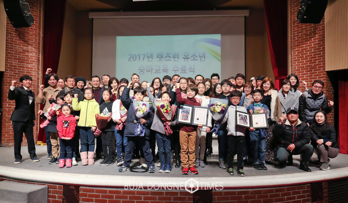 [부자동네타임즈 신동현 기자]한국마사회(회장 이양호)가 10일(일) 렛츠런파크 서울 문화공감홀에서 ‘2017 렛츠런 유소년 승마단’ 수료식을 시행했다. ‘렛츠런 유소년 승마단’은 한국마사회가 유소년 승마인구 저변 확대와 미래 승마 수요 창출을 위하여 2010년 창단했으며, 올해로 8기 수료생을 배출했다.